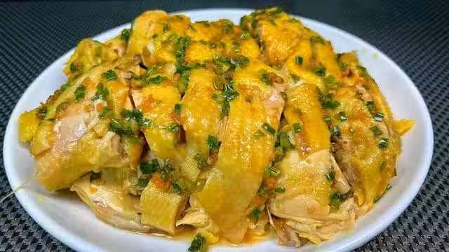 1、先把雞處理乾淨,放入幾片生薑,一把蔥結,半勺食鹽。然後再給雞做個全身按摩去除雞的腥味,然後再來一勺花生油塗抹在雞的表皮上面,使雞的表皮也非常光滑。