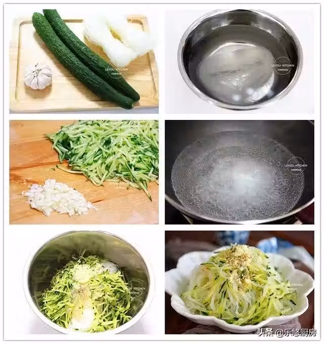 第五步:把焯過水的粉絲、黃瓜絲、蒜末、熟白芝麻放入盆中,再依次放入1勺鹽、少許雞精、1勺白糖、2勺香醋、少許香油拌勻。