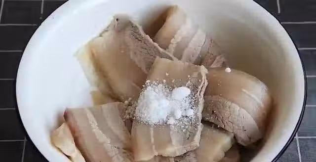 今天分享一個五花肉的新吃法。鍋中涼水下入洗乾淨的五花肉,加入蔥姜料酒,開大火燒開,開鍋之後把浮沫打去,蓋上蓋子轉中小火燉20分鐘。20分鐘後將五花肉控水撈出。