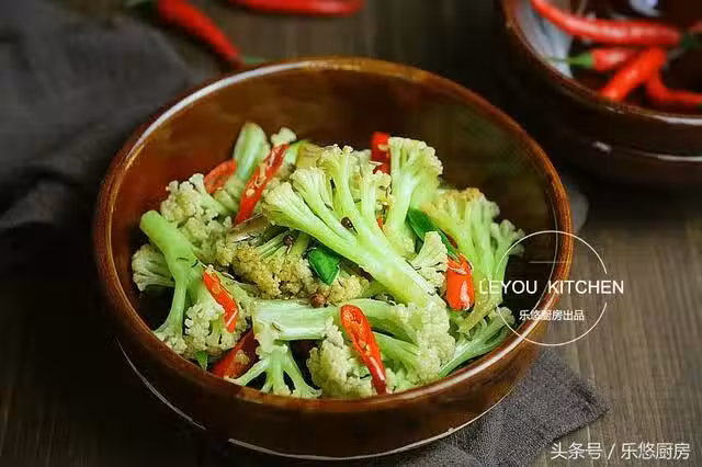 第一步:準備食材。有機菜花適量、小紅辣椒適量、青蒜苗適量、蒜適量。