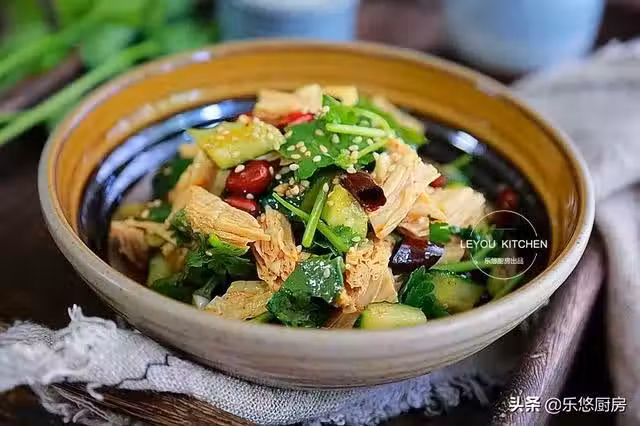第一步:準備食材。腐竹適量、黃瓜1根、花生米少許,香菜2根、蒜適量。