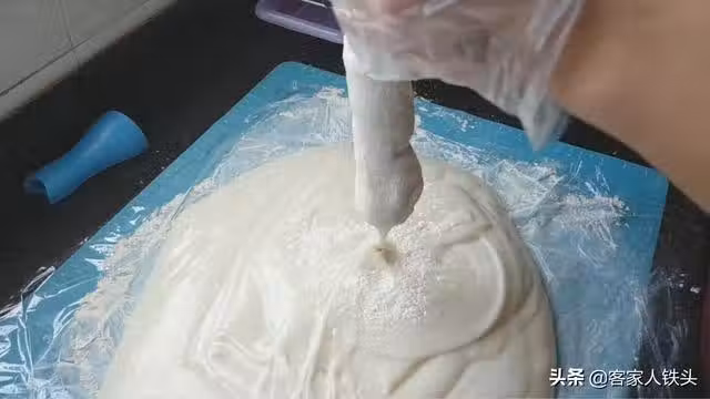 第九步:我們來開始做客家糯米糍了,取小團,粘點熟糯米粉,把它揉圓,按扁,裝適量芝麻花生餡,慢慢收口,把它包起來