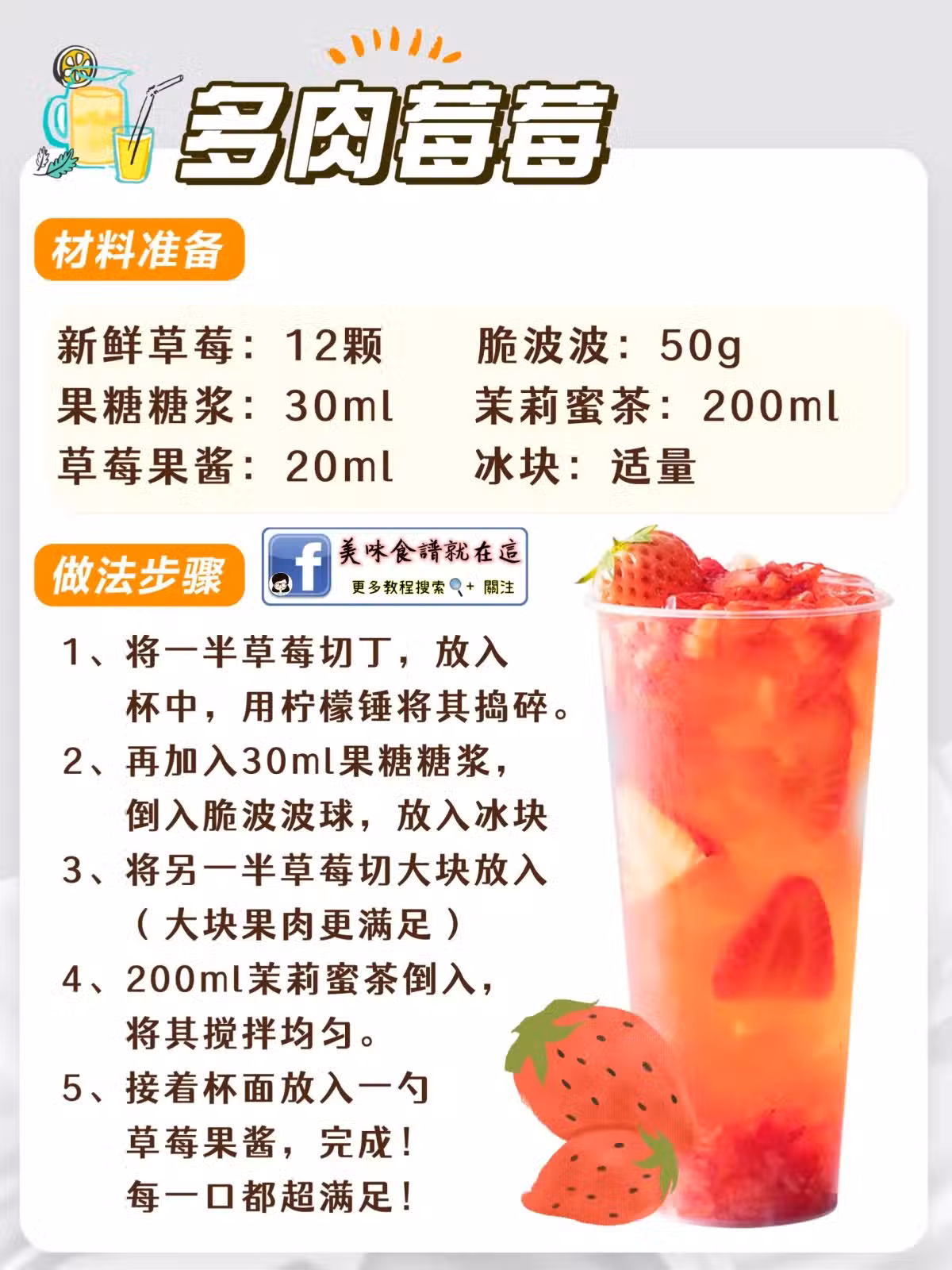 📋材料準備:新鮮草莓12顆、脆啵啵50g、果糖糖漿30ml、茉莉蜜茶200ml、草莓果醬20ml、冰塊適量