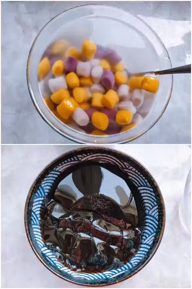 13. 將煮熟的芋圓泡在涼開水中,這樣芋圓口感更Q彈。14. 把凝固成型的仙草凍用刀劃成大塊,倒入碗中。