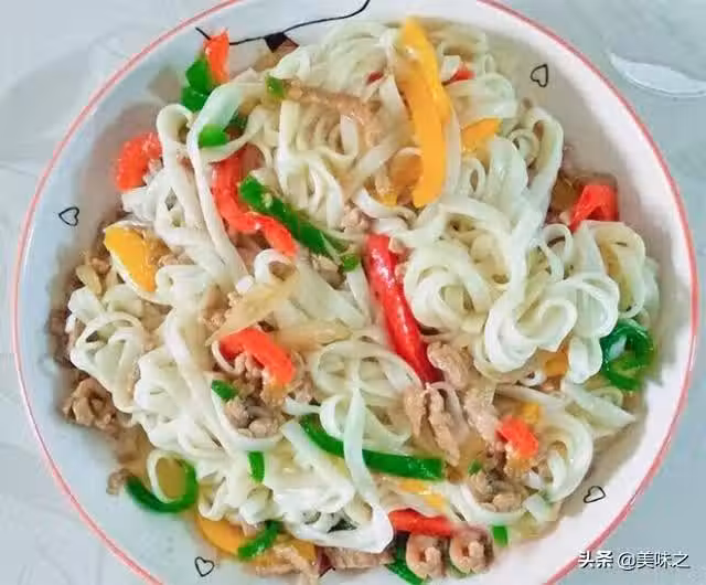 手擀麵300克、裡脊肉150克、青椒1個、彩椒2塊、洋蔥1塊、油少許、醬油少許、蚝油少許、鹽少許、五香粉少許、澱粉少許、雞汁少許。