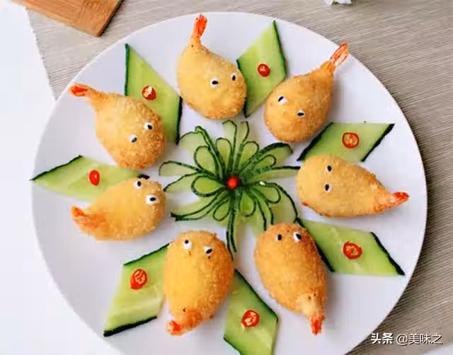 明蝦十個、麵包糠一碗、干澱粉適量、雞蛋一個、黃瓜一根、沙拉醬適中、黑芝麻適中、咸鹽少許。