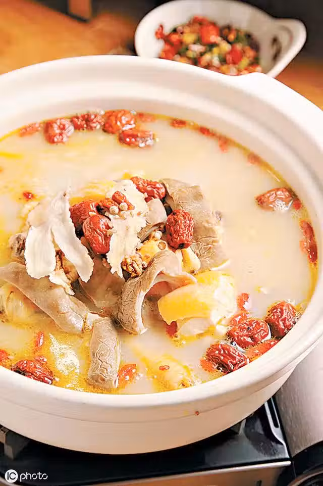 4、 水 9 杯或適量煲滾,將胡椒粒、豬肚、豬粉腸、瘦肉加入煲滾,改為文火 煲 3 小時,加鹽調味即可。