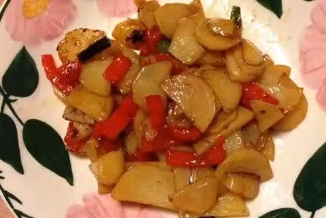3.起鍋燒油,下入蔥姜蒜片爆香,下入土豆片炒香,調入醬油、生抽、鹽、味精炒出醬香味,下入紅辣椒翻炒出香,沿著鍋邊加入少許清水,充分翻炒均勻入味,收一下汁,淋少許明油(蔥炸的油即是明油,家裡平時可以多炸一些,炒菜、涼拌等加一點香味翻倍),翻拌均勻即可出鍋裝盤。