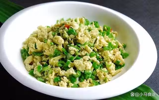 3.再起鍋燒油,下入蔥蒜末爆香,下入青辣椒炒出辣味,調入鹽、醬油、少許胡椒粉、雞精,下入雞蛋,淋入少許香油,快速炒散,即可出鍋裝盤。