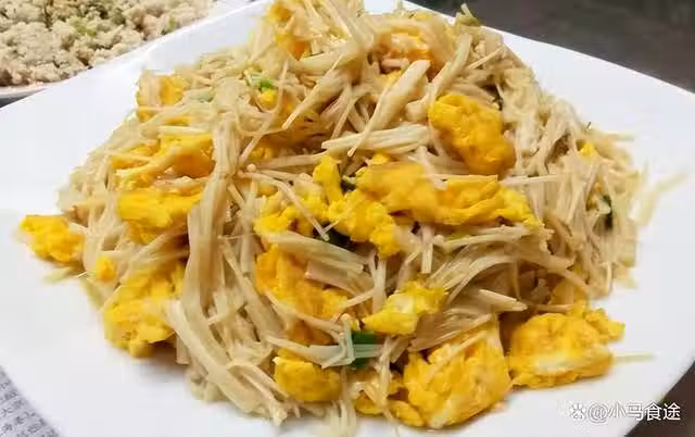 2.起鍋燒油,下入雞蛋炒熟,再接著下入金針菇,調入鹽、生抽、味精、雞精,炒勻即可出鍋裝盤。