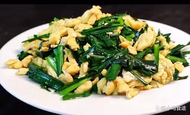 2.起鍋燒油,下入打散的雞蛋液炒熟,下入韭菜段,調入鹽、少許胡椒粉,翻炒均勻,韭菜炒斷生迅速出鍋裝盤。