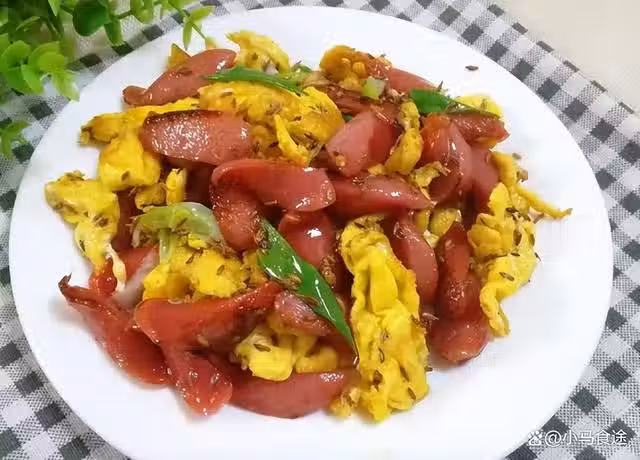 2.起鍋燒油,下入打散的蛋液炒熟盛出,再加入少許色拉油,下入脆皮烤腸,煎炒出香,下入先蒜苗白,調入生抽、少許麻辣鮮,炒一炒,再下入雞蛋和蒜苗葉,充分翻炒均勻,即可出鍋裝盤。
