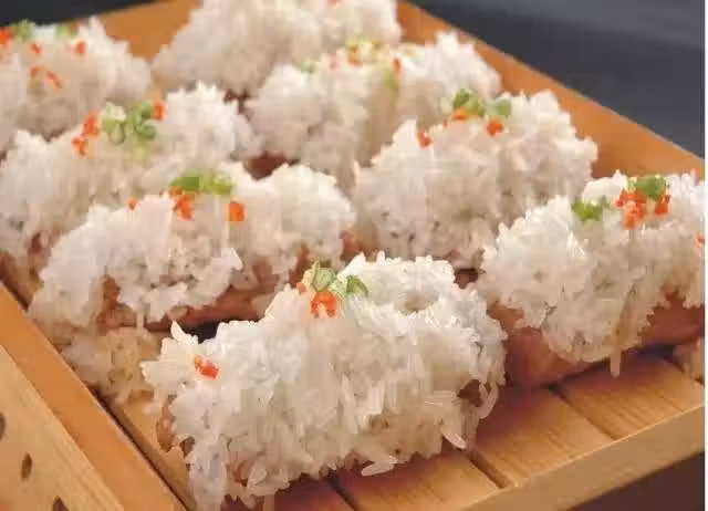 原料:糯米200克、豬小排300克、細香蔥2根、五香粉1/2茶匙、醬油1/2湯匙、蠔油1/2湯匙、料酒1湯匙、植物油1/2湯匙、食鹽1/2茶匙。