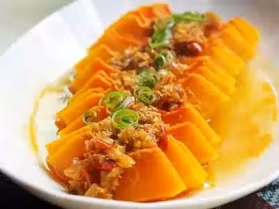 原料:南瓜300克、紅椒1大勺、蒜2大勺、蔥1大勺、薑1小勺、高湯1小勺、生抽2大勺、香油1小勺、水2大勺。