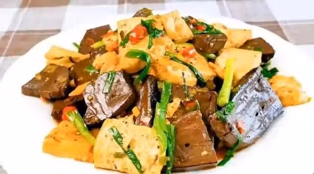 韭菜鴨血燒豆腐,鴨血燒豆腐是一款家常菜,非常適合秋冬季節食用,鴨血鮮嫩,豆腐細嫩,二者口感相似,紅白相間,加入韭菜色澤靚麗,更加有風味。