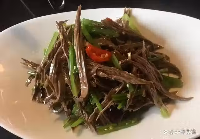 芹菜熗黑腐竹,這道爽口涼菜很受餐廳歡迎,黑腐竹營養價值高,黑色比白腐竹更誘人,搭配芹菜用熱油熗拌,味道噴香,上桌即光碟。