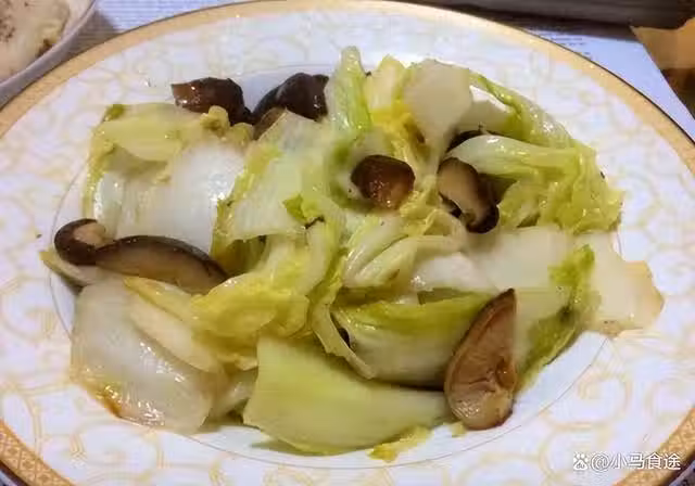 2.起鍋燒油,下入香菇片直接煸炒出香,再下入白菜片翻炒均勻,調入鹽、少許生抽、少許胡椒粉、翻炒入味,即可出鍋裝盤。