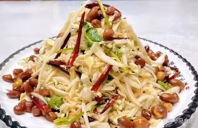 1.大白菜摘洗乾淨,改刀切成絲,納入盆中,加入干辣椒絲、乾花椒粒,蒜末,用燒冒煙的熱油激發出香味,蓋住悶一下,讓香味留住,再翻拌均勻。