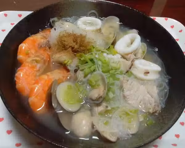 蔥香湯頭粉 3匙,白鬍椒粉 1/2小匙,蔥風味油 1大匙,濕米粉 350克,蟹腿肉 1盒,蝦 120克,魚肉 150克,蛤蠣 150克,薑末 1大匙,芹菜 2大匙,韭菜 1枝,水 1500c.c.