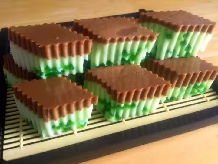 2. 把上層材料 一起煮滾,攪入Milo,小心倒在下層的燕菜上(避免有小氣泡,影響表面光滑)待冷,放入冰箱冷藏.