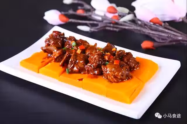 材料:豬排、南瓜、薄荷葉、姜蒜末、鹽、醬油、豆豉醬、醋各適量。