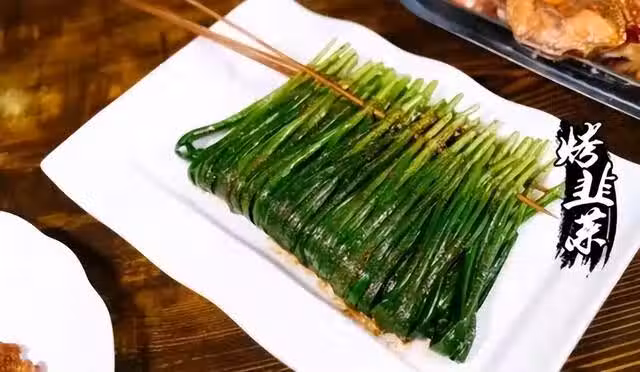 1.韭菜摘洗乾淨,用竹籤子串起來,煎餅鍋淋油,下入韭菜串,煎至斷生,撒上燒烤料,即可出鍋裝盤。