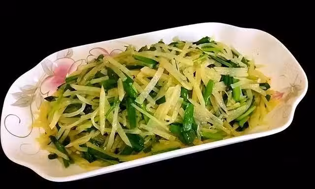 2.起鍋燒油,下入土豆絲翻炒出香,調入鹽、味精、雞精,翻炒至土豆絲斷生,下入韭菜段,炒至韭菜斷生,雞精出鍋裝盤。