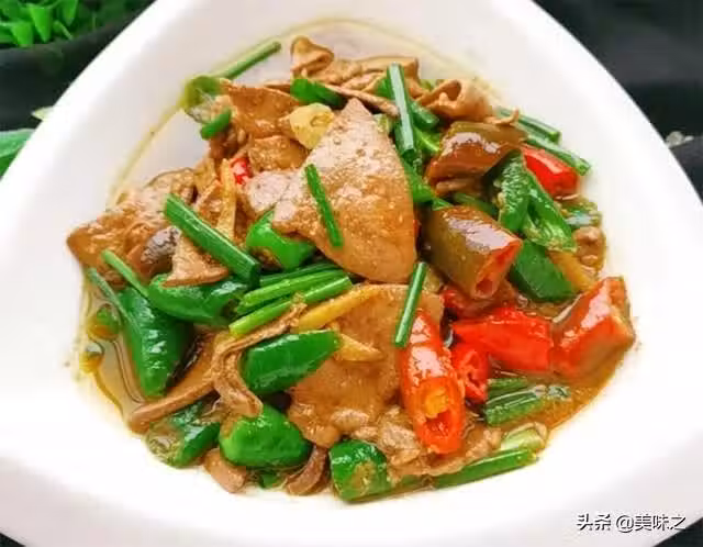 豬肝適量、青椒2個、紅辣椒2個、姜適量、大蒜頭適量、料酒適量、澱粉適量、油適量、鹽適量、雞精適量、蚝油適量、胡椒粉適量、米酒適量、生抽適量。