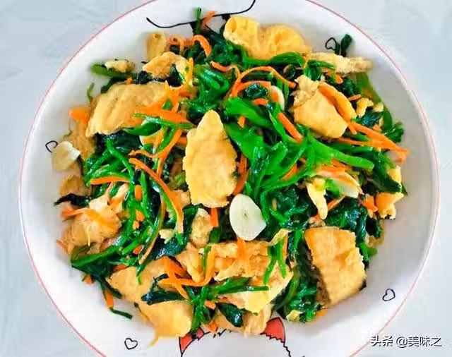 3、另啟鍋炒香蔥蒜胡蘿蔔,加點蚝油,加鹽和五香粉,最後加焯好的菠菜,快速翻炒出鍋。