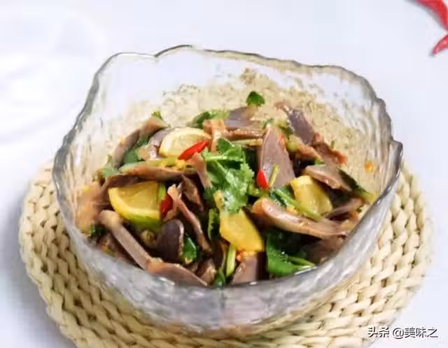 鴨胗350克、檸檬半個、香菜2棵、辣椒1隻、蒜1瓣、醬油2湯匙、蚝油1湯匙、醋1湯匙、鹽適量、油適量。