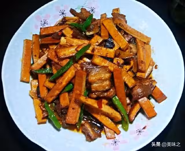 五花肉300g、豆腐乾250g、青線椒4個、姜1片、蒜瓣2顆、花椒幾粒、紅油豆瓣醬1勺、老抽幾滴、生抽1小勺、雞精1小勺、鹽1小勺、食用油少許。