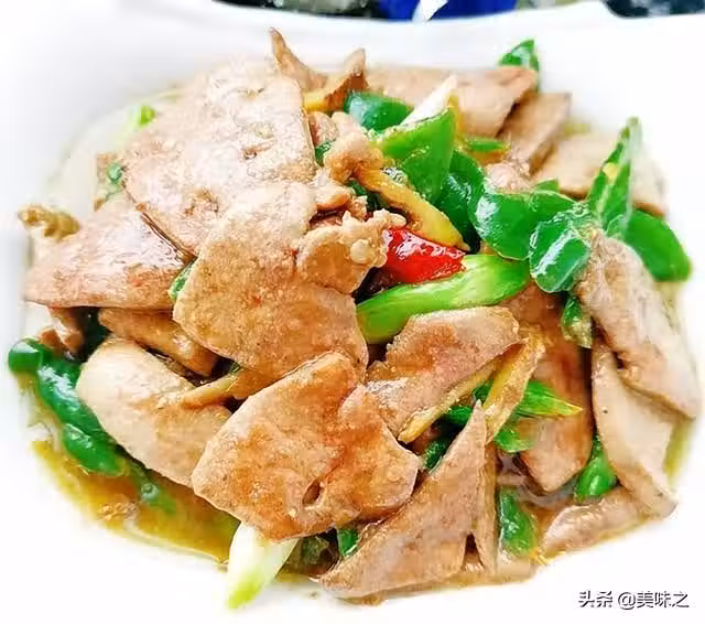 豬肝400克、青椒一個、姜適量、蒜苗2根、干辣椒2個、澱粉適量、油適量、鹽適量、雞精適量、蚝油適量、米酒適量、生抽適量。