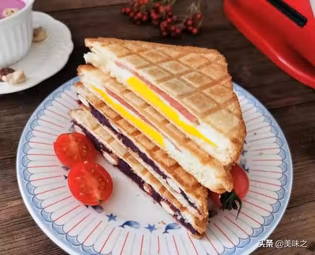 7、三明治做好後沿著對角線切開或橫線切開都可以。