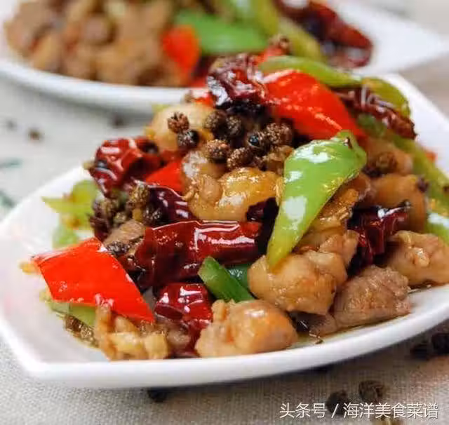 材料:雞腿400克,青椒50克,紅椒50克,花椒10克,干辣椒25克,薑片20克,蔥段15克,大蒜片10克,醬油30毫升,料酒15毫升,糖5克,香油5毫升,鹽適量,雞精少量,油,鮮湯50毫升