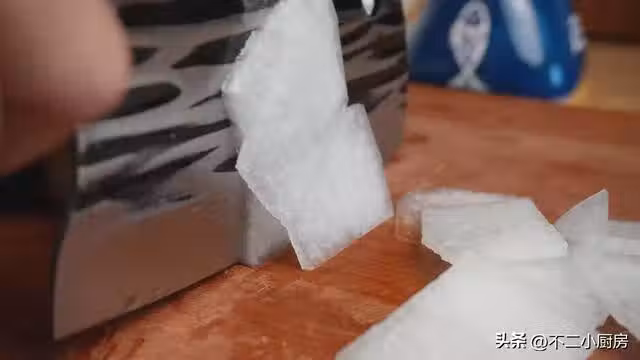 4、準備一塊處理乾淨的冬瓜,把冬瓜從中間一分為二,再切成薄薄的厚片,厚度大約掌握在兩毫米左右,這樣的冬瓜比較的嫩滑,也比較容易入味,切好之後放入到碗中備用,再準備少許的薑片、小蔥花和蝦米。