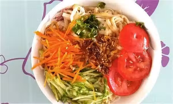 鍋內水燒熱,下掛麵; 間歇快速切黃瓜絲和胡蘿蔔絲,西紅柿片和香菜末;調料汁:蔥末、蒜末、蝦米、橄欖油、芝麻油、糖、鹽、白芝麻,並將「料汁」放進微波爐中高火30秒待用 面煮至8分熟撈出,過涼 ,也可放冰箱稍微冷藏一下 擺盤:將過涼後的麵條擺在盤中間,馬上配菜,澆上料汁 依個人口味放上香醋或是辣椒油即可。