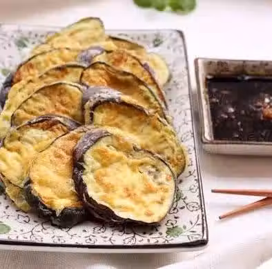 3、平底鍋燒熱,倒入油,將茄子片裹上面糊,放入鍋裡,煎至兩面金黃,茄子瓤熟軟即可出鍋;