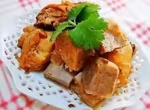 1. 將香芋去皮切塊,雞肉洗凈切塊,用沸水焯去血水,撈出備用。