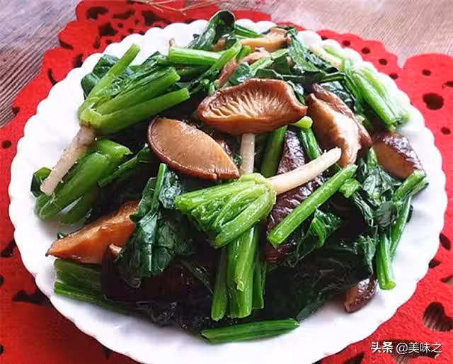 5、將香菇炒熟,放菠菜,鹽味精,翻炒均勻即可。