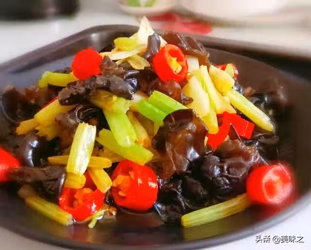 木耳干、芹菜、紅辣椒、姜、蒜、鹽、雞粉、生抽、食用油。