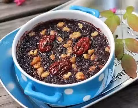 原料:粳米150克,黑芝麻20克,棗干25克,白砂糖30克。