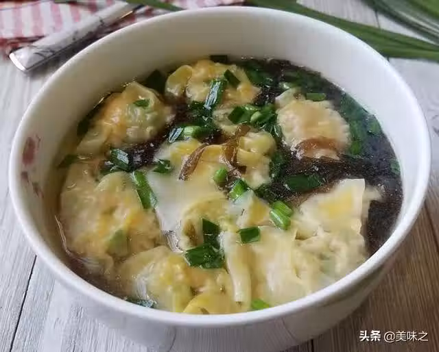 10、撈出餛飩,放入碗里,澆上紫菜湯即可開吃。