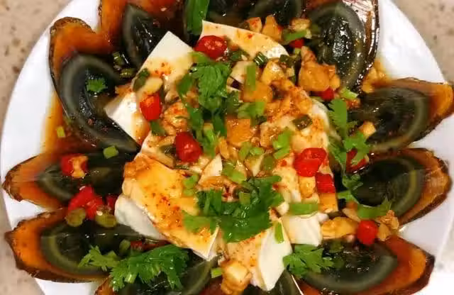 (1)皮蛋剝殼對半切四瓣,豆腐沖洗一下切塊,小蔥切蔥花,蒜瓣切末,小米辣切圈。