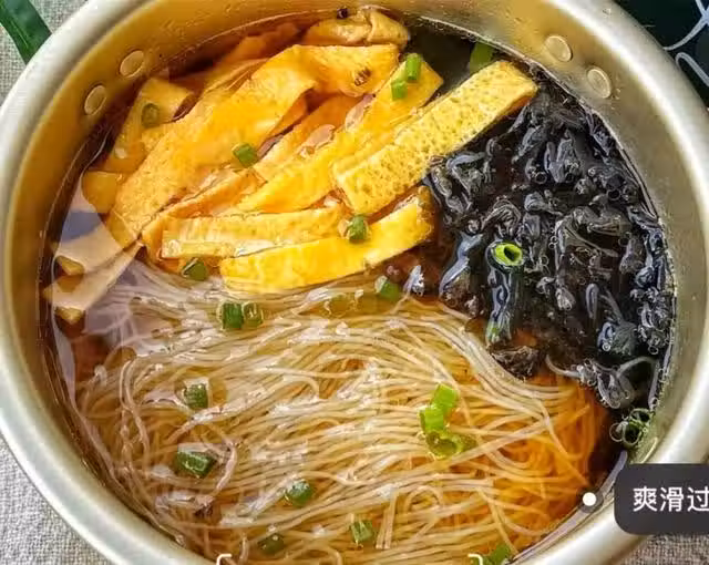 (3)鍋中放入粉絲、紫菜、雞蛋條蓋上鍋蓋大火煮開轉小火。