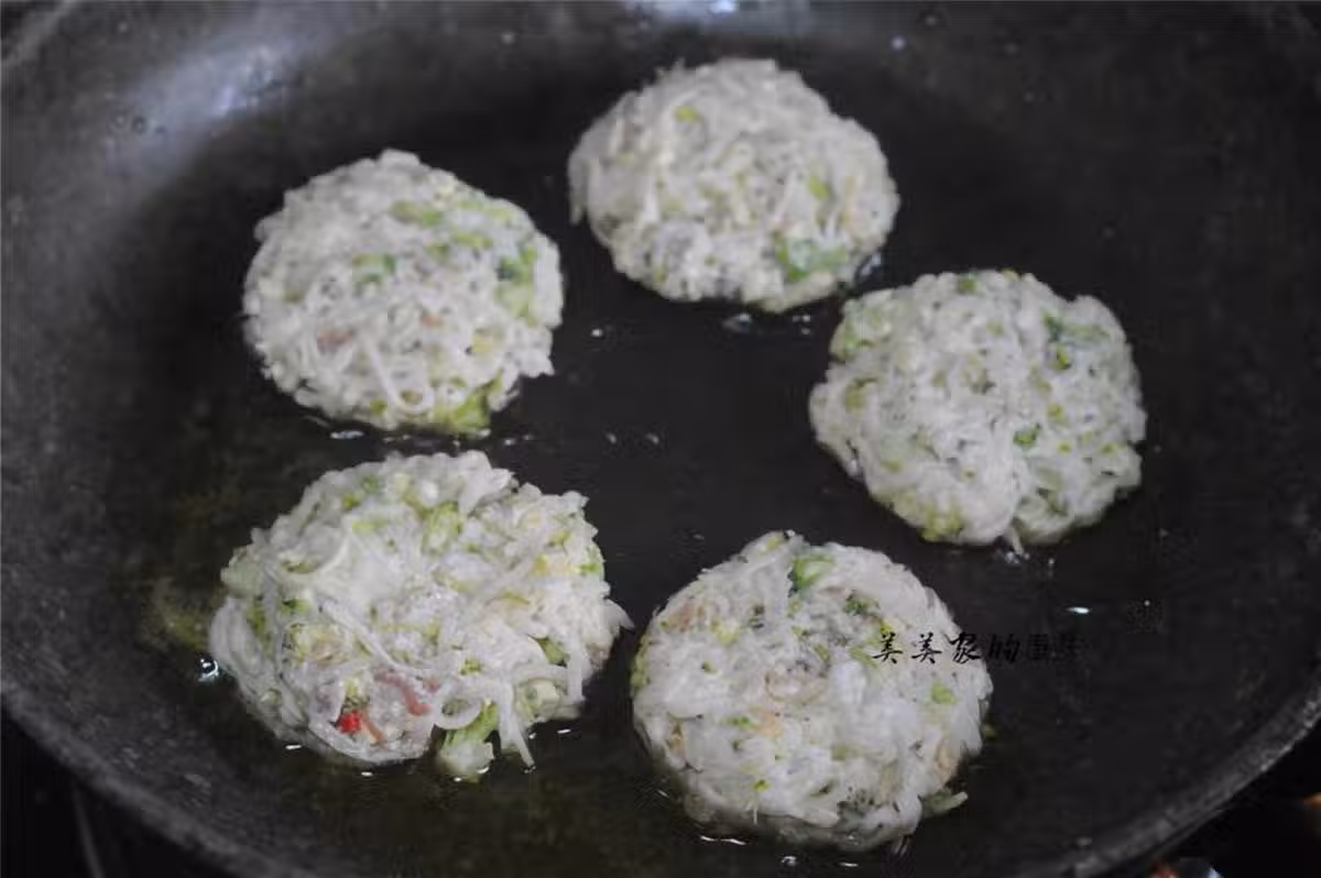 平底鍋里倒入兩勺油,將蘿卜絲餅擺入鍋中中小火慢慢煎。