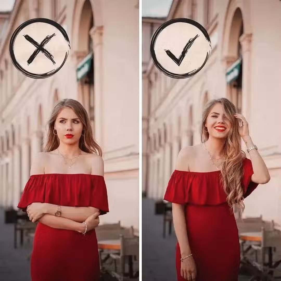 拍半身照別把手給藏起來,這樣拍出來會很尷尬,可以讓自己自然抬手撩撩頭髮,配合微笑看鏡頭,自信大方有魅力,很漂亮。