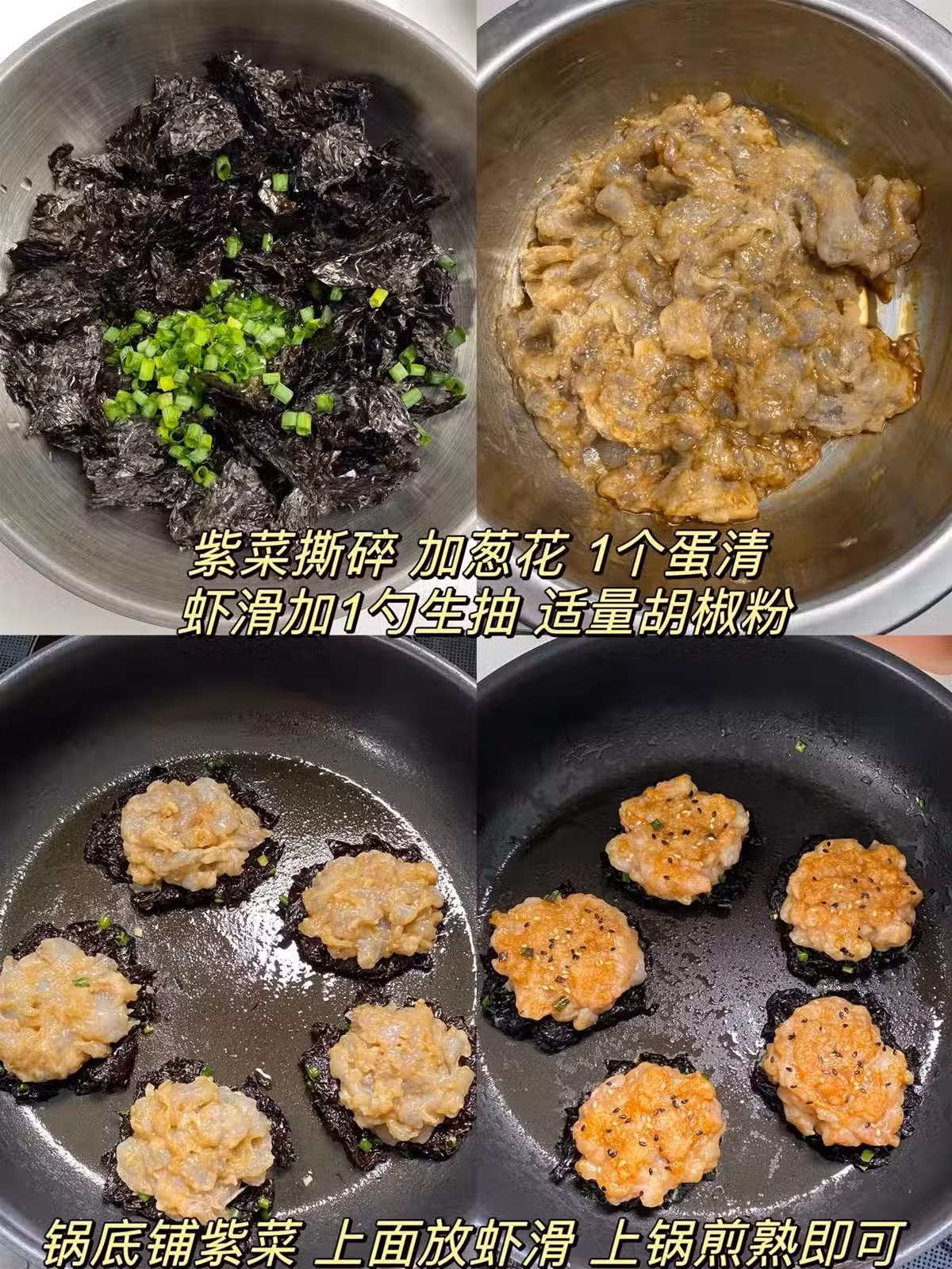3、鍋底刷油鋪上紫菜 上面放蝦滑 小火煎熟即可~