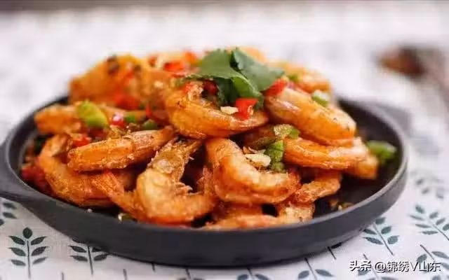 5.把鍋里油倒出,只需一點點油爆香蒜片和小米辣,入炸好的蝦翻兩下,再入椒鹽翻均勻即可出鍋