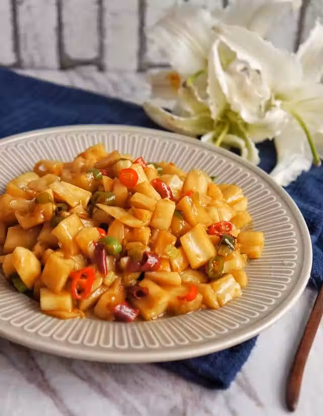 4.鍋里放入油小火爆香乾辣椒,放入藕丁炒半分鐘,放上料汁炒勻,放入香蔥、青紅椒炒半分鐘,加入水澱粉炒勻就可以了