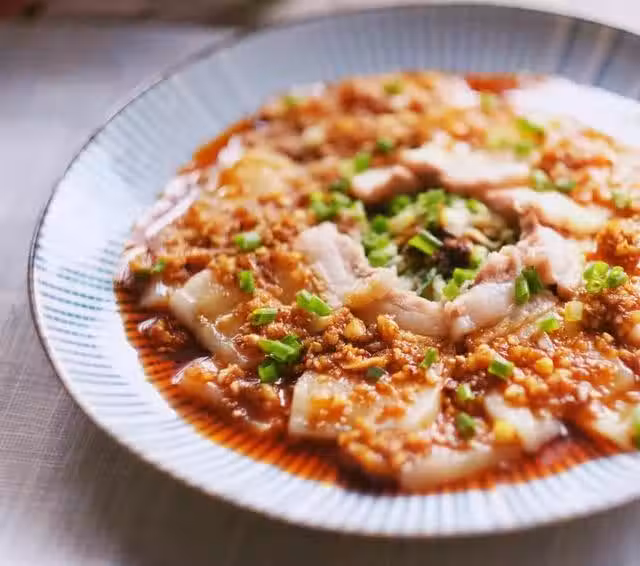 3.擺盤,中間放點蔥絲點綴,或者是青瓜絲也可以。燒好熱油,淋在剁好的蒜末上